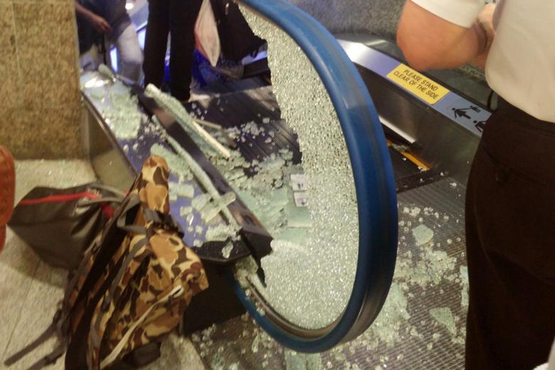The incident, which happened at about 9.20pm, left glass shards strewn across the top of the down-riding escalator leading towards Bugis MRT station.