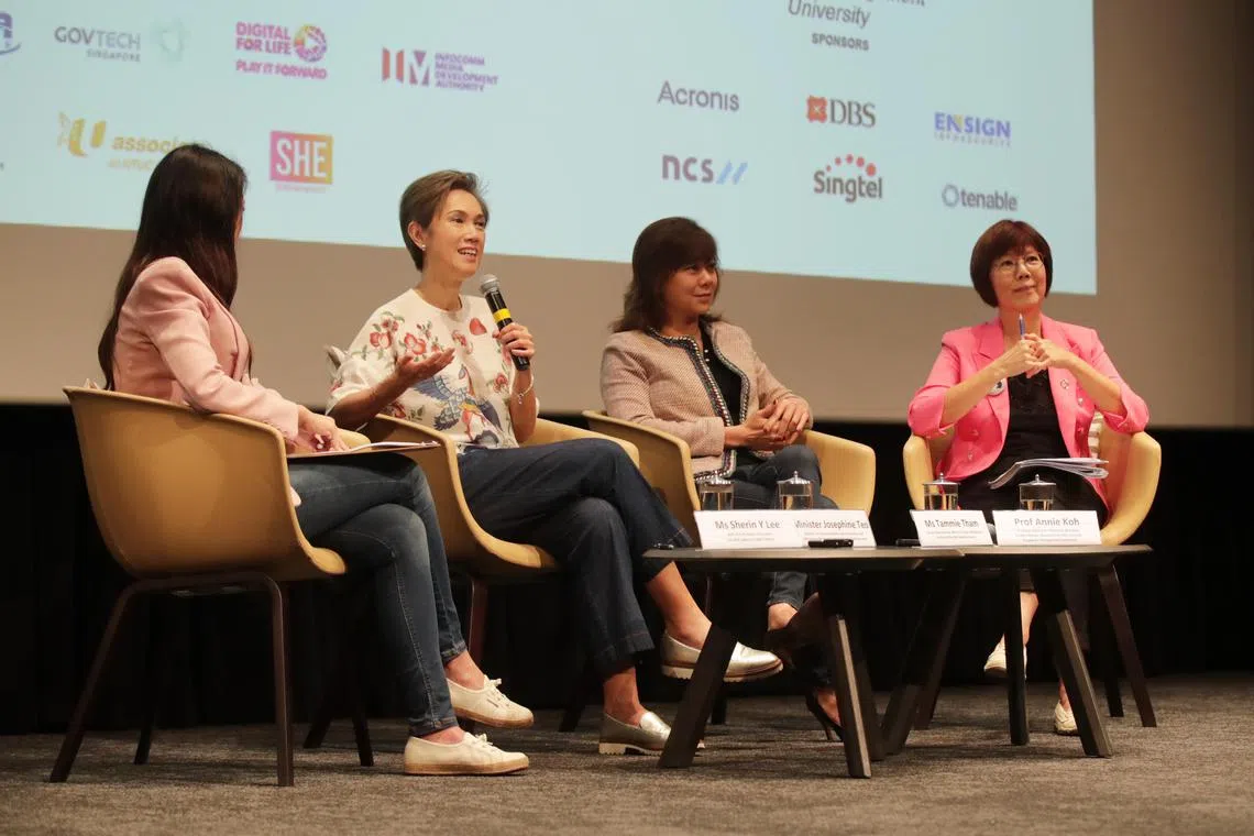 (From left) Moderator Sherin Lee, Minister for Communications and Information Josephine Teo, Ensign InfoSecurity group chief executive Tammie Tham and Singapore Management University professor emeritus of finance (practice) Annie Koh.