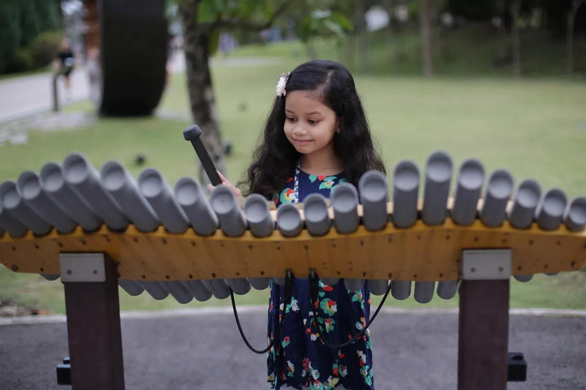 A child playing an instrument at Gardens by the Bay’s Active Garden on May 15, 2022.