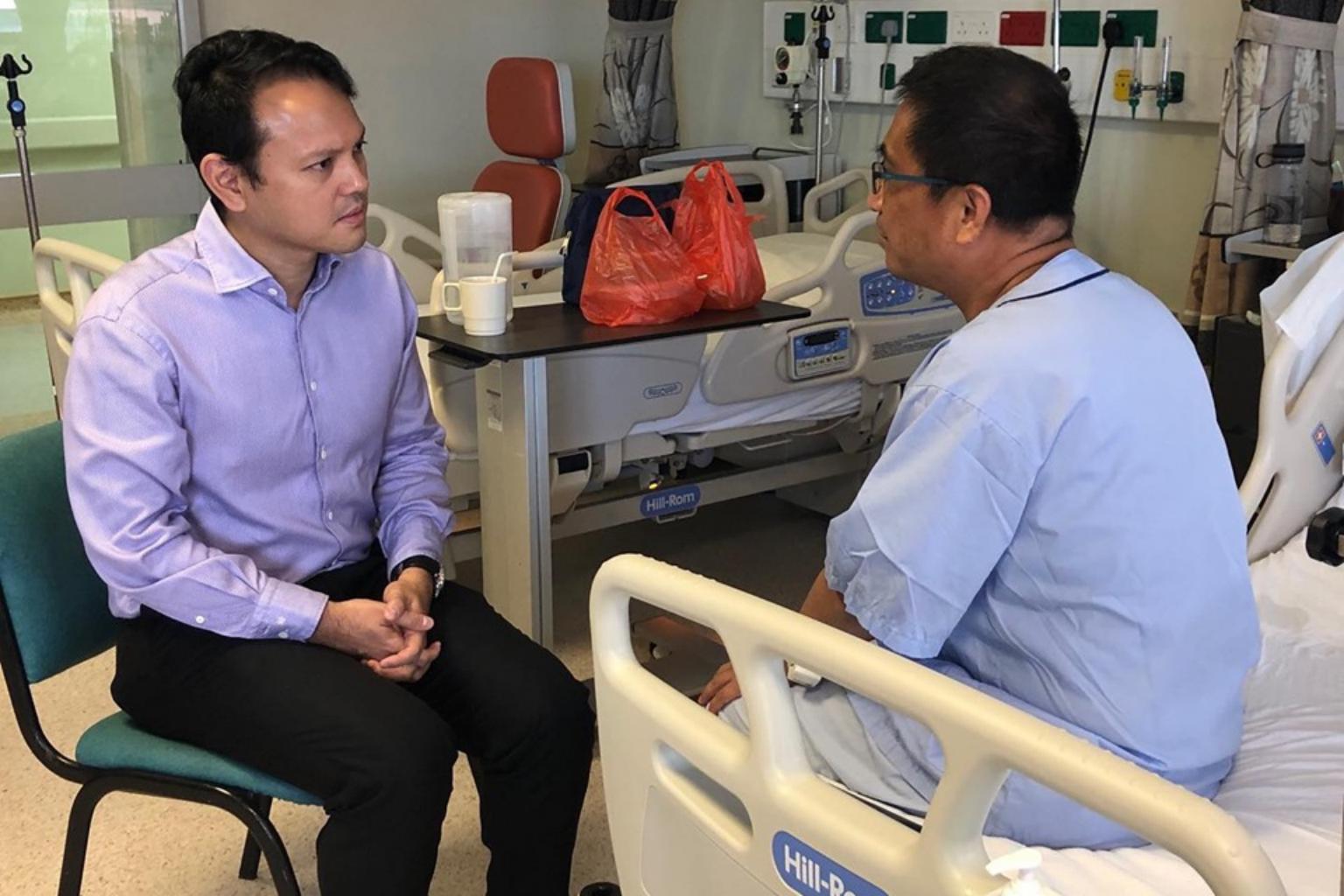 Minister of State for Manpower Zaqy Mohamad (left) visiting one of the workers who suffered burns in a fire at their workplace in Jurong Island.