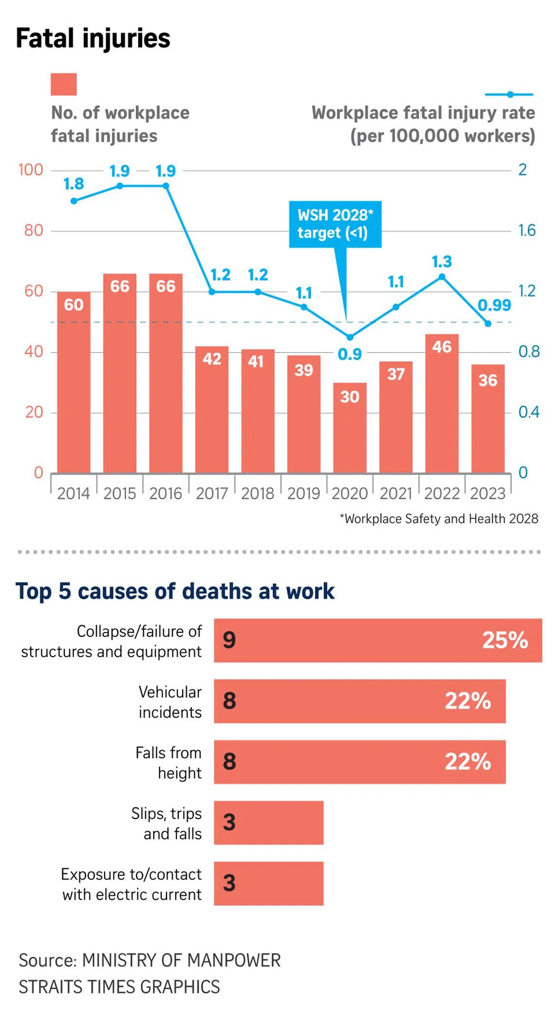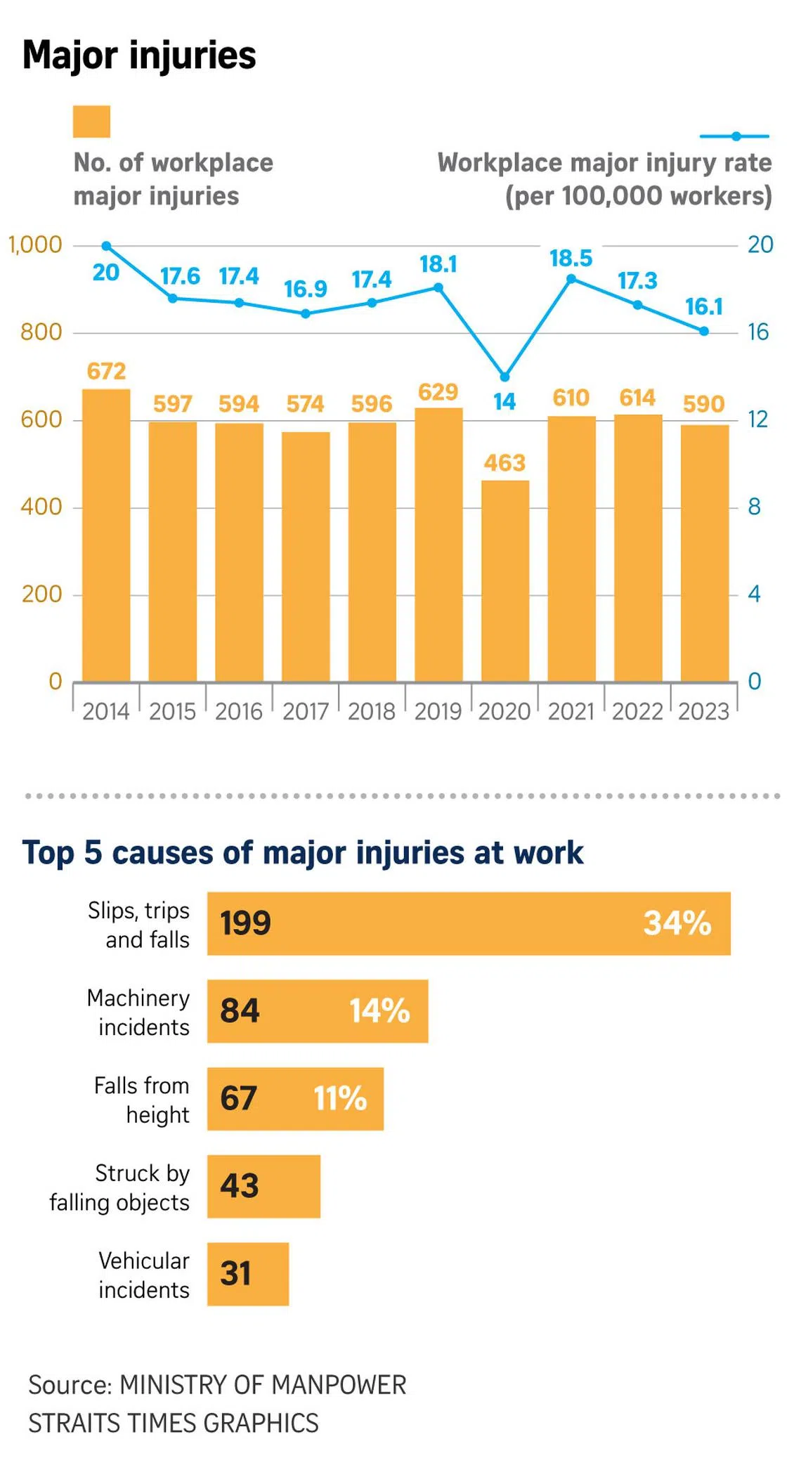 SINGAPORE - For every 100,000 workers, about 16 had major injuries at work, and fewer than one died on the job in 2023.
