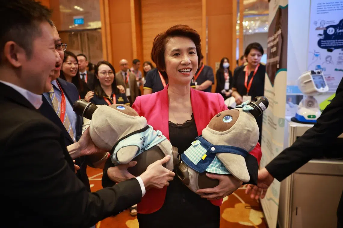 Minister of State for Culture, Community and Youth Low Yen Ling carrying Lovot companion robots for the elderly on May 24.