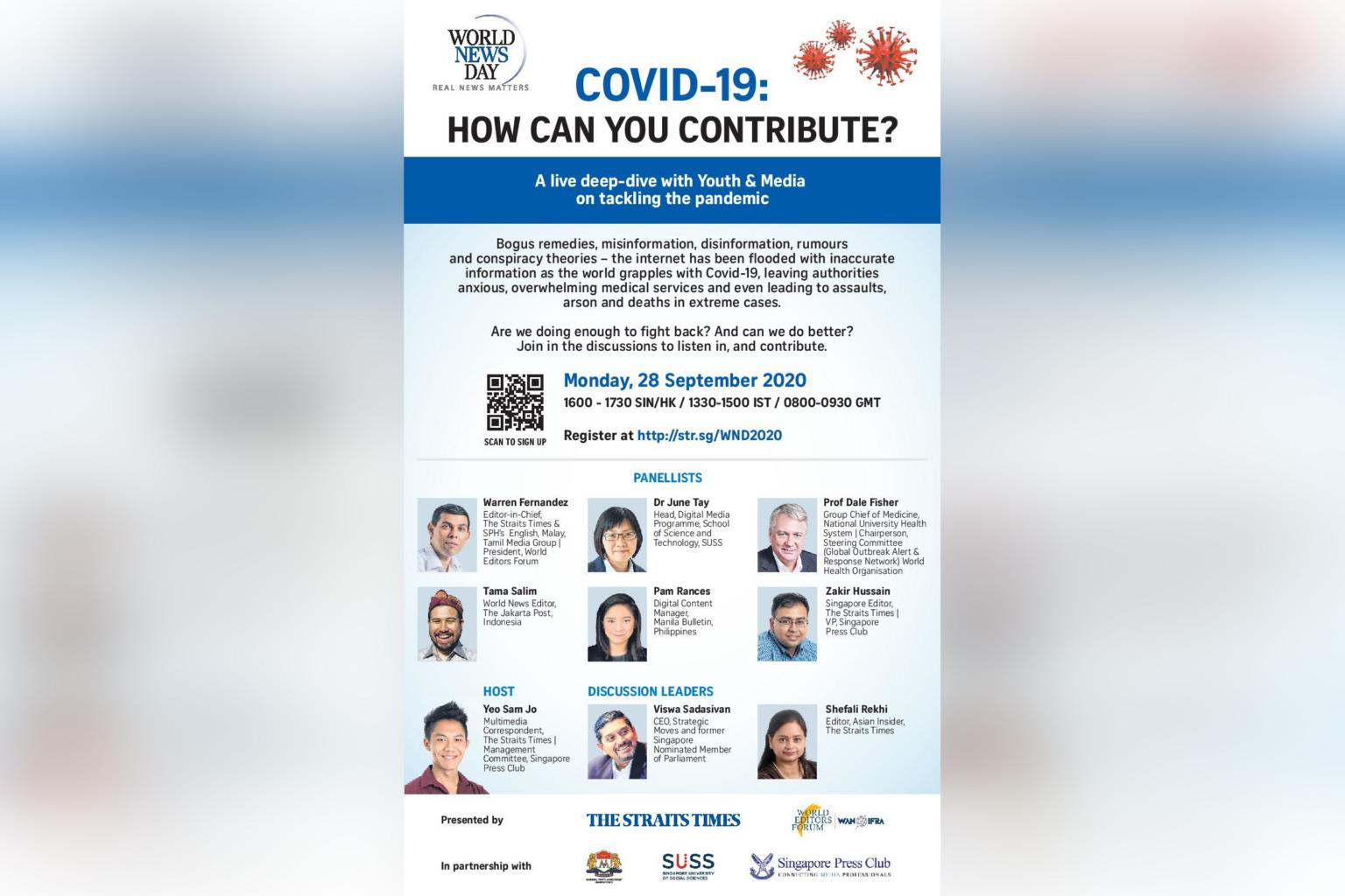 A webinar titled "Covid-19: How Can You Contribute?" will feature panellists such as Professor Dale Fisher, an infectious diseases expert; Mr Viswa Sadasivan, chief executive of Strategic Moves and former Nominated MP; Dr June Tay, head of the digital media programme, School of Science and Technology at the Singapore University of Social Sciences (SUSS); and several editors from the region.