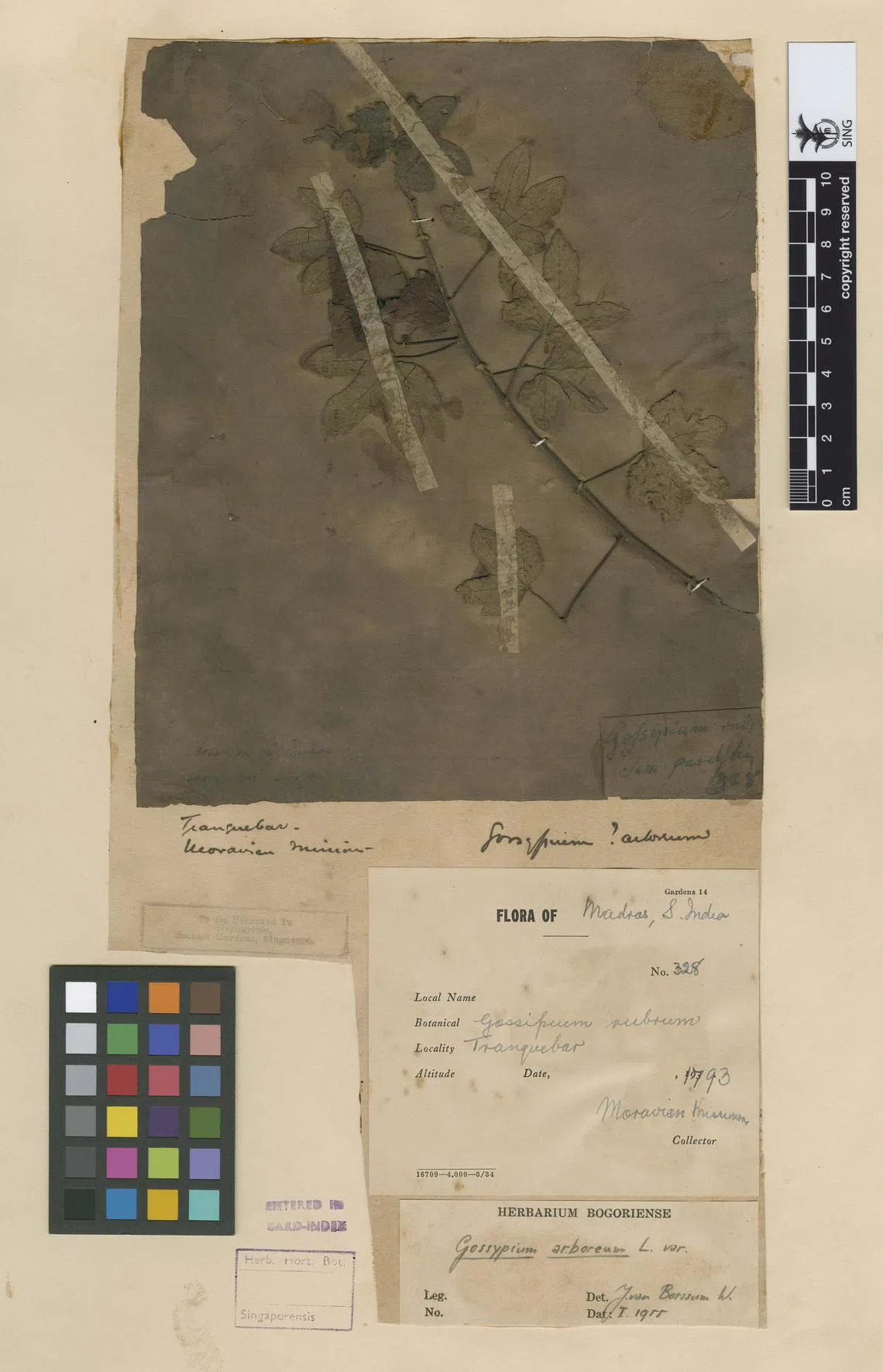This tree cotton (Gossypium arboreum) is one of the oldest specimens in the Singapore Botanic Gardens Herbarium, dating back to 1793.