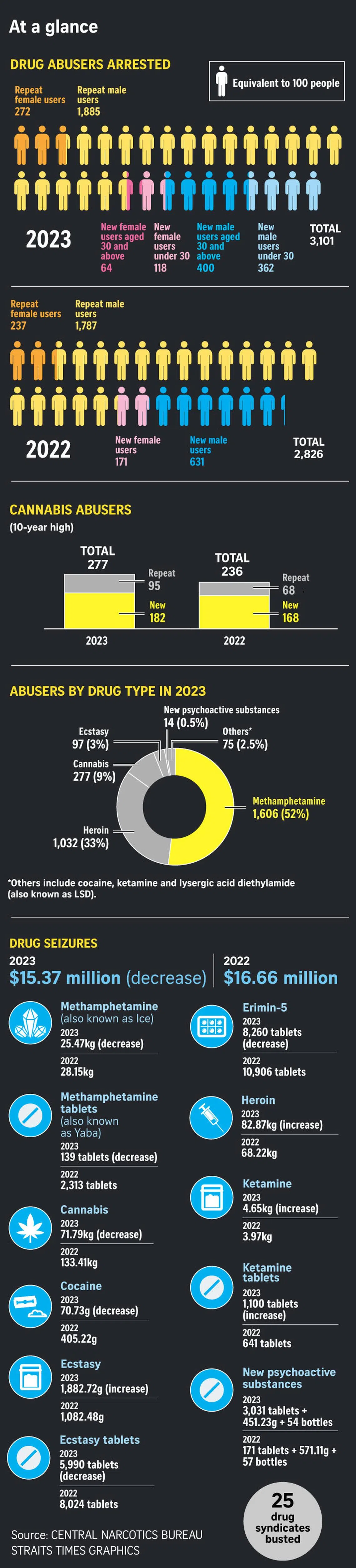Official figures released on Feb 14 showed that the number of drug abusers arrested in 2023 was up by 10 per cent to 3,101, compared with 2,826 arrested in 2022.