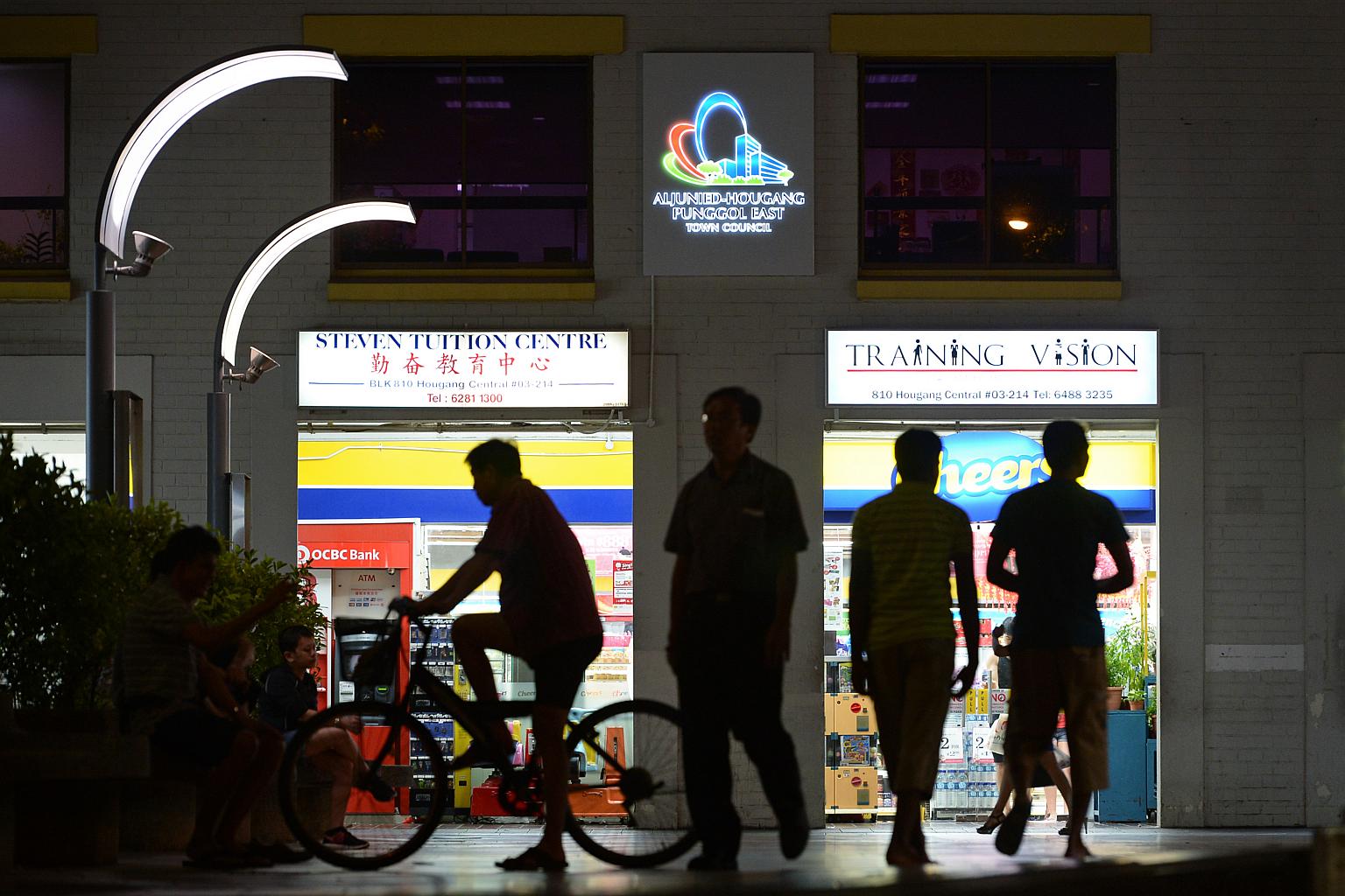 People outside the former Aljunied-Hougang-Punggol East Town Council (AHPETC) building at night on Feb 13, 2014.