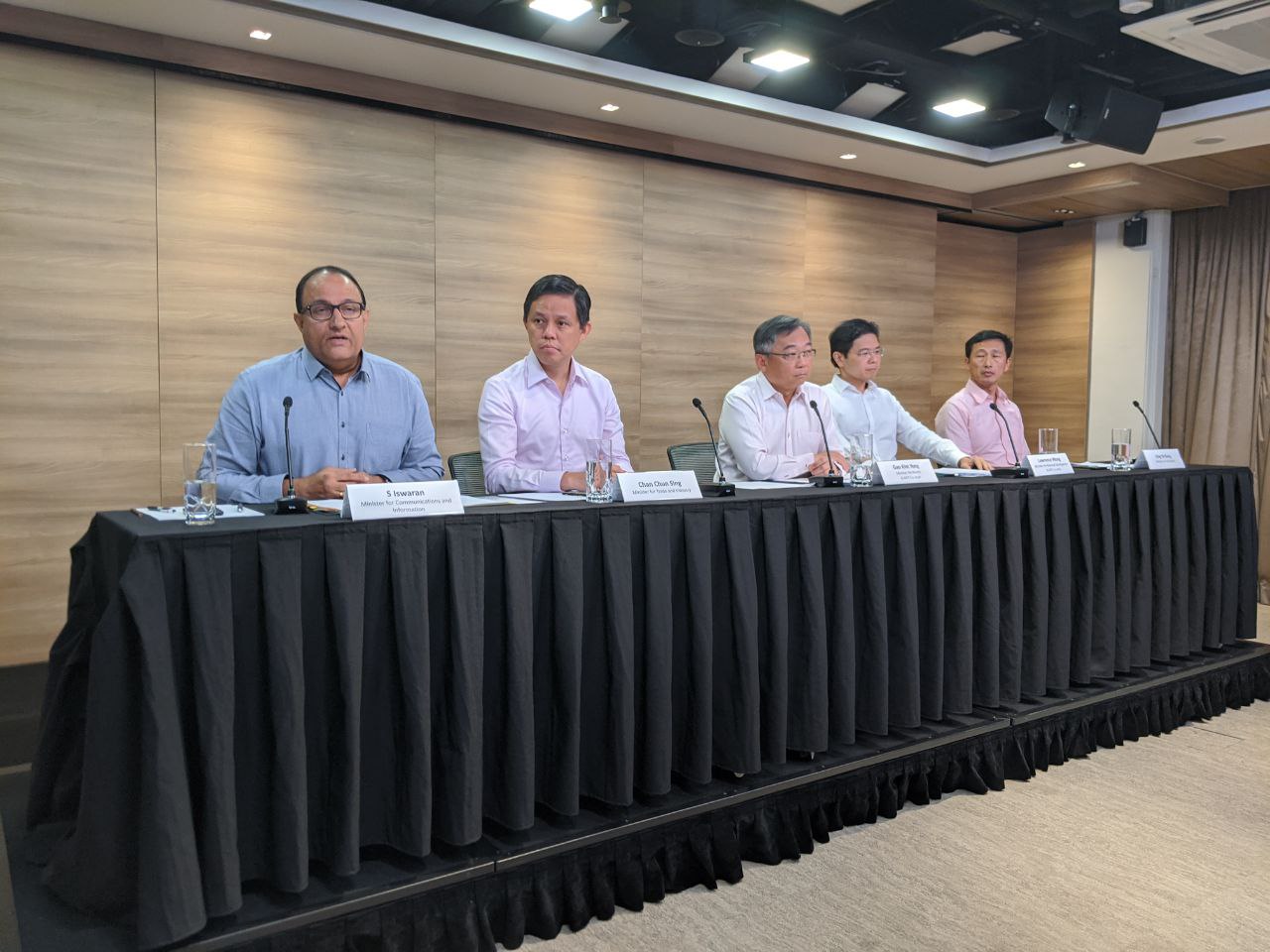 (From left) Communications and Information Minister S. Iswaran, Trade and Industry Minister Chan Chun Sing, Health Minister Gan Kim Yong, National Development Minister Lawrence Wong and Education Minister Ong Ye Kung at the press conference, on Jan 27, 2020.