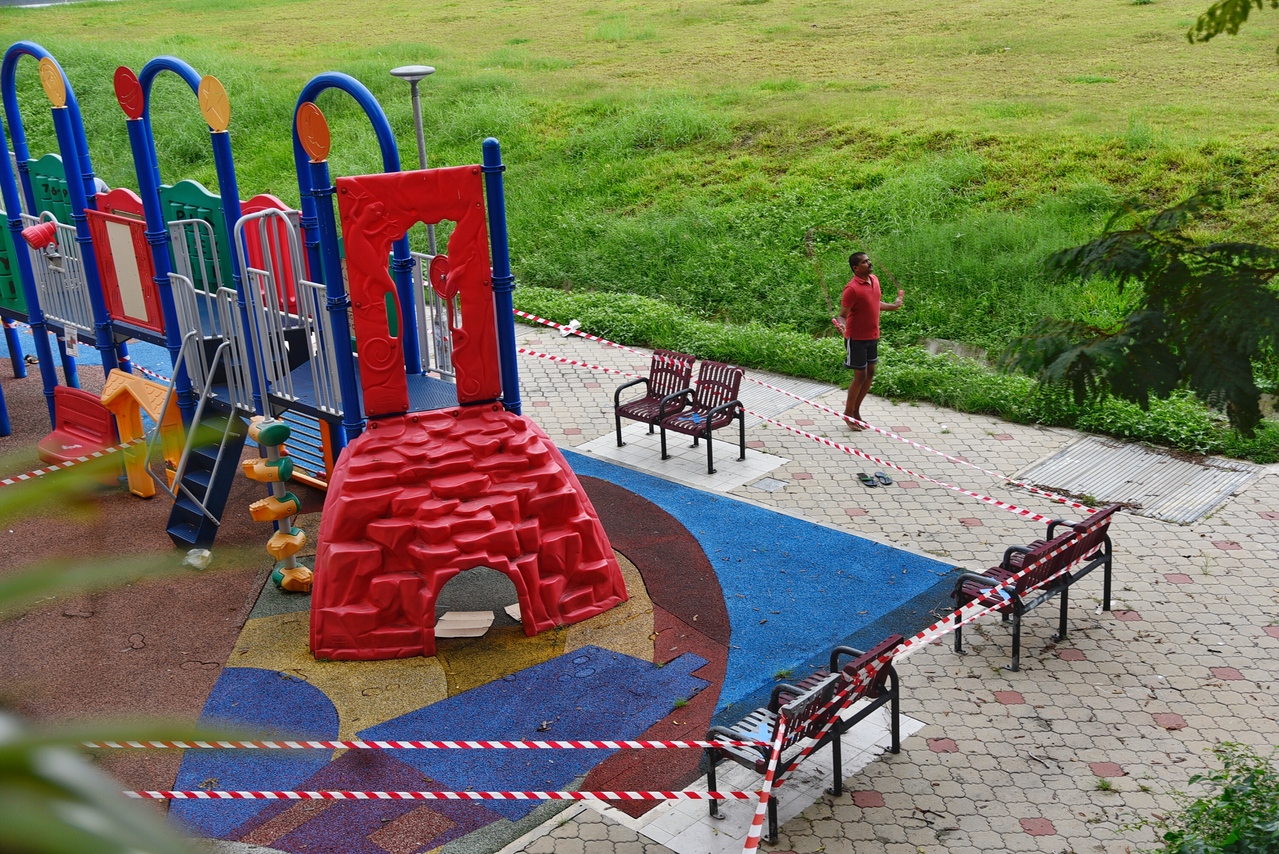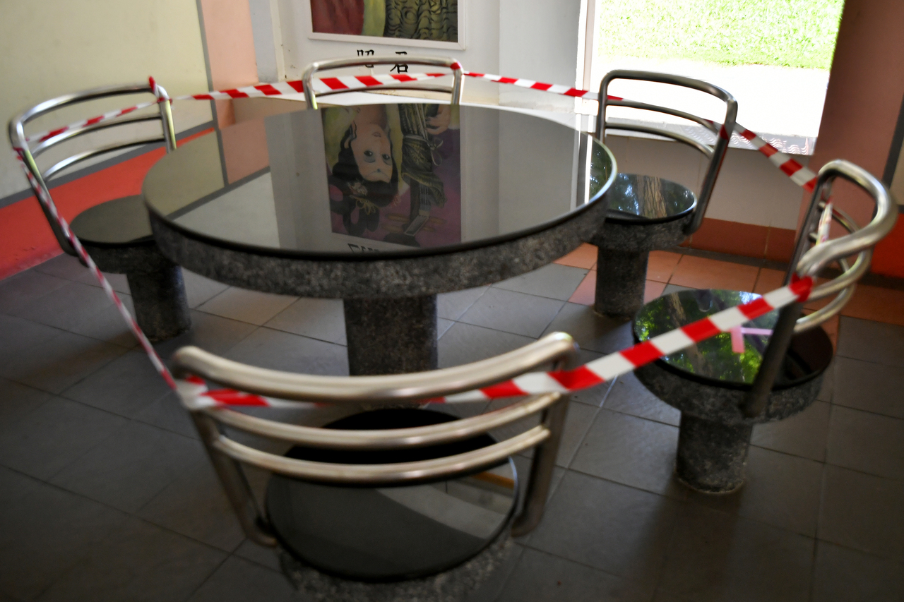 Tables and seats at a void deck in Bedok Reservoir Road are sealed off with red and white tape.