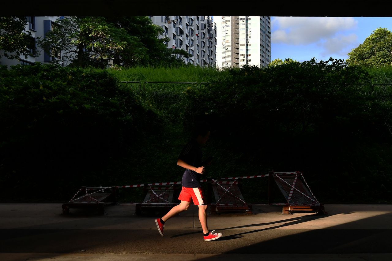 A person jogs past sit-up stations lined with red and white tape under the MRT viaduct between Bishan and Ang Mo Kio MRT stations on May 15, 2020.