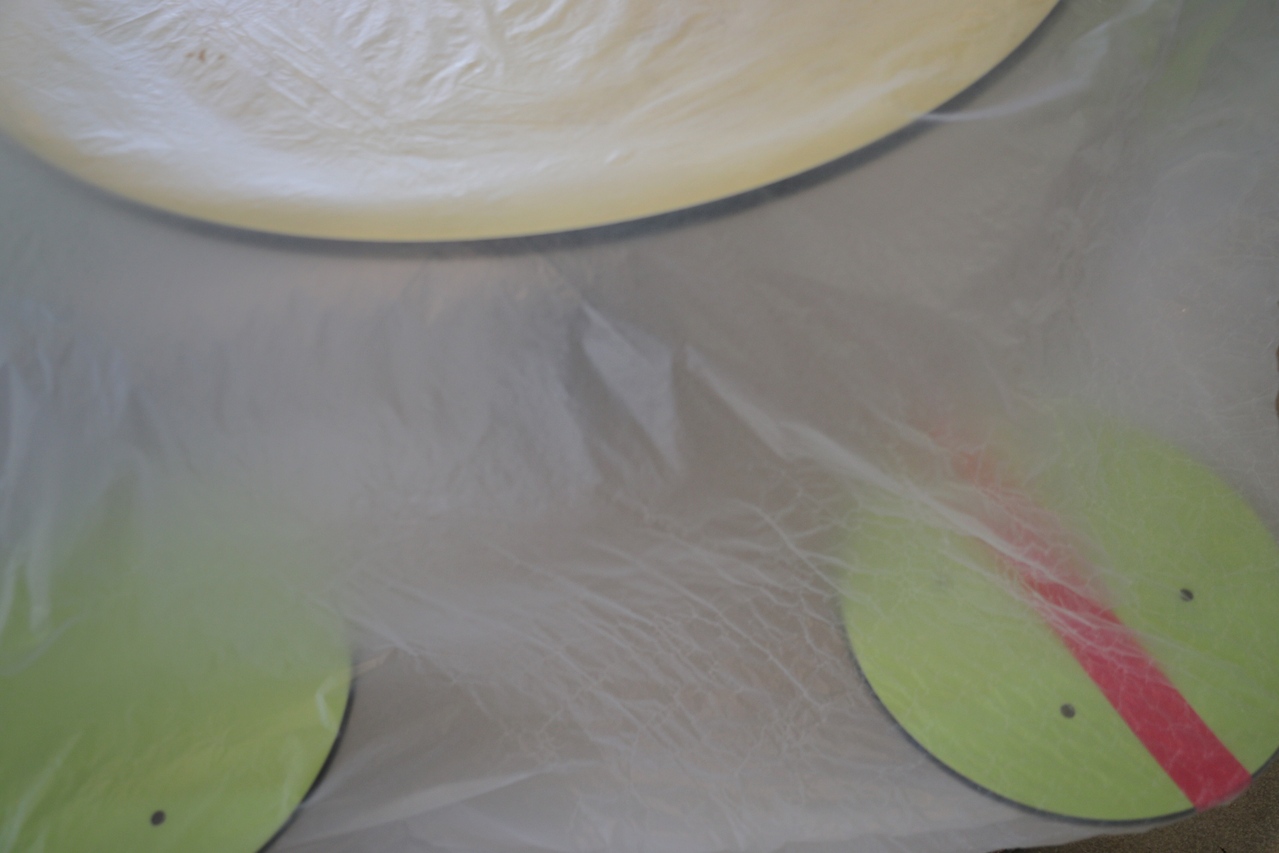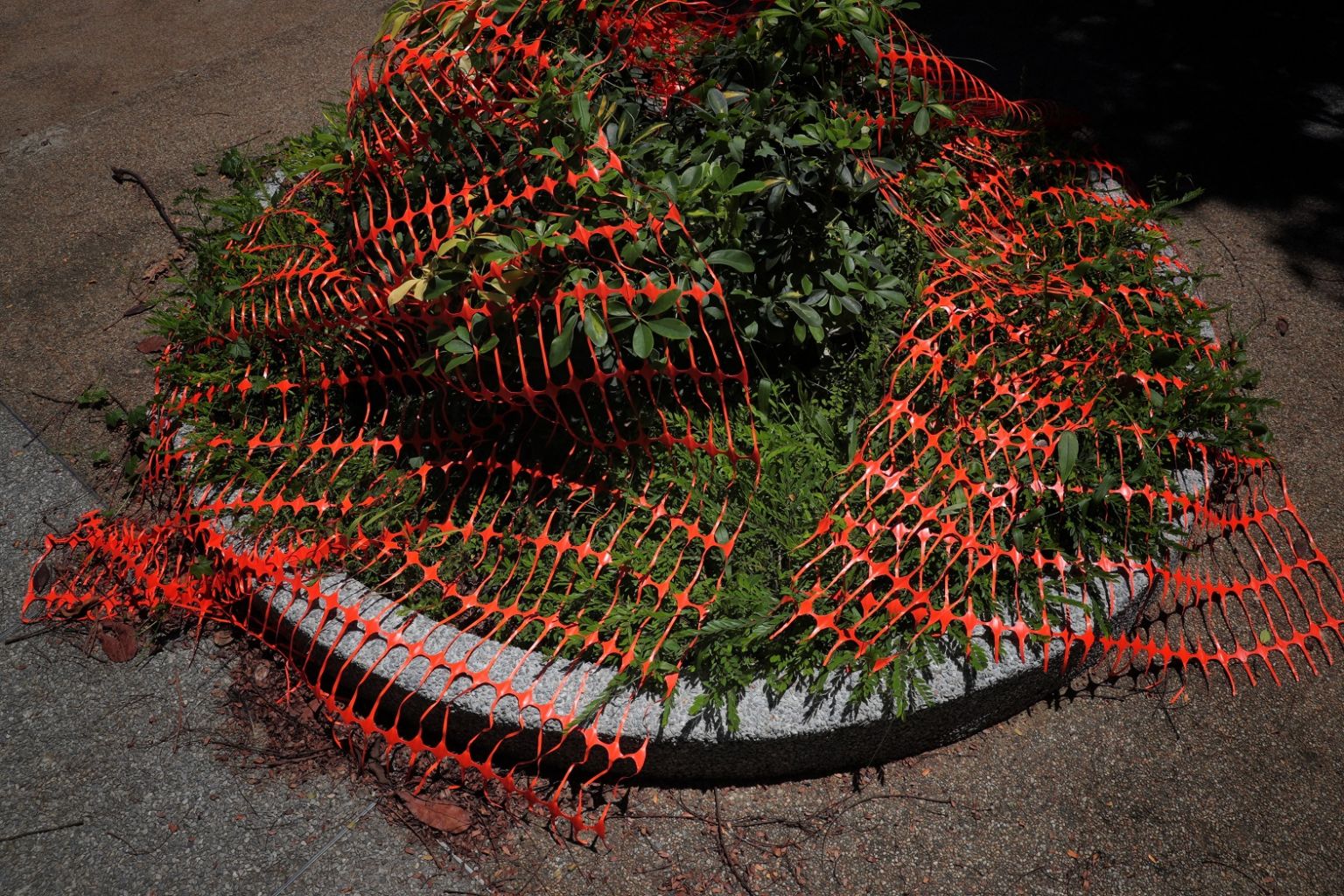 A shopper doing stretching exercises in Plaza Singapura on a stone seat marked with red crosses, a water cooler in HortPark is all taped up, while a plot of plants in Teban Gardens is covered with nettings (above), during the circuit breaker period.