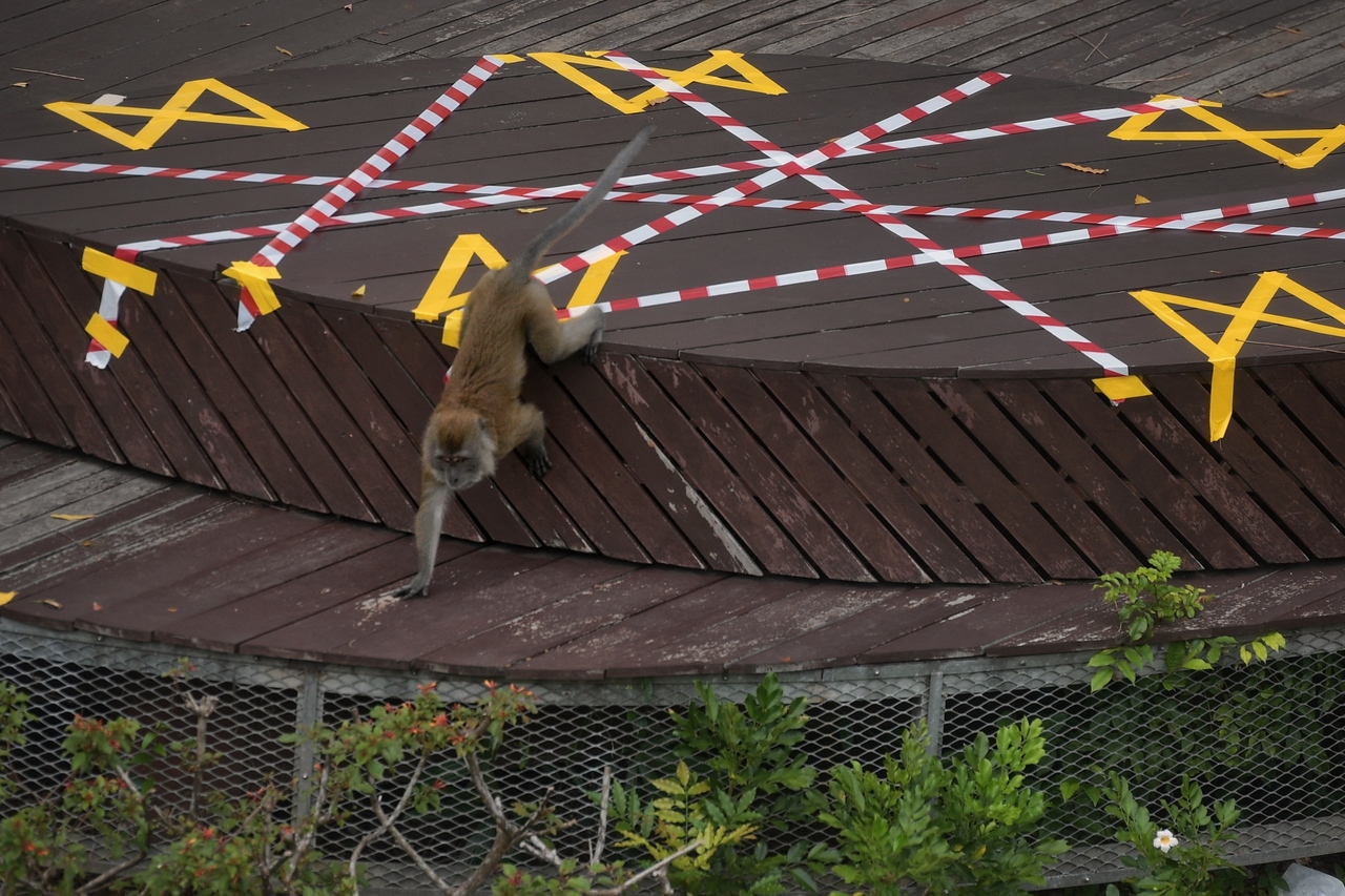 A long-tailed macaque climbing off a sitting area cordoned off with tape at the MacRitchie Reservoir on April 17, 2020.