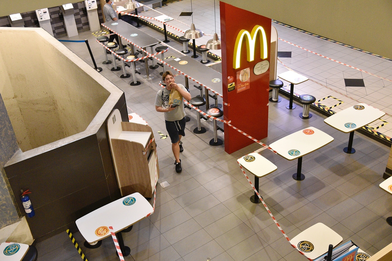 A customer eats fries while exiting a McDonald's outlet in Parklane on April 7, 2020.
