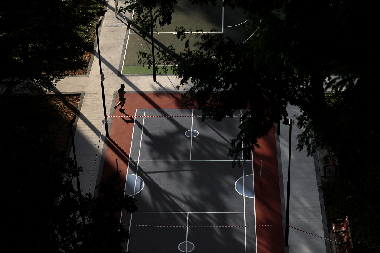 A man jogs around a taped up badminton court in Bedok on April 18, 2020.