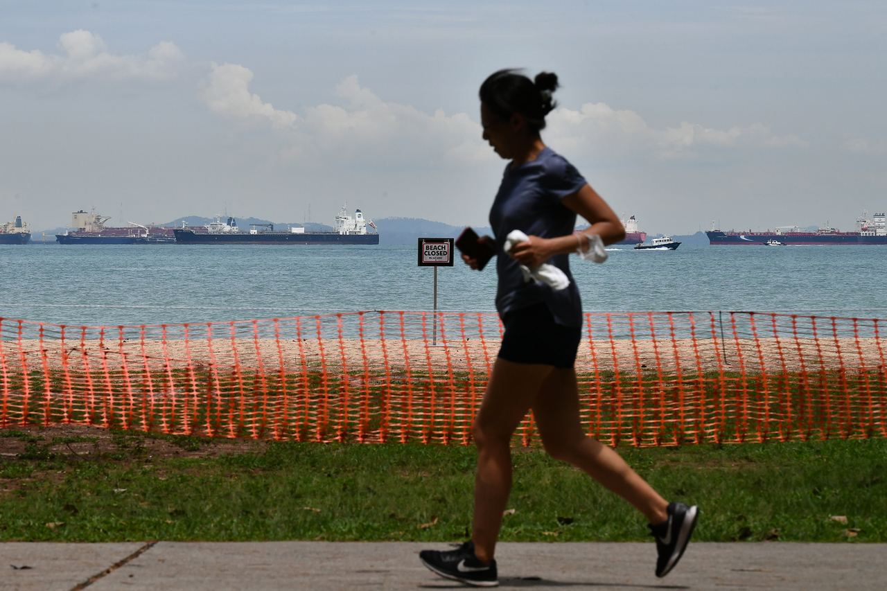 A woman jogs past the closed beach at East Coast Park on April 28, 2020.