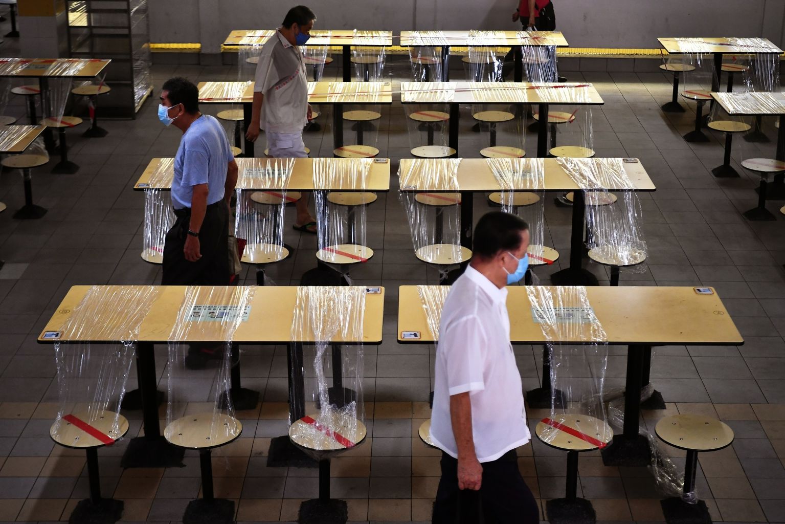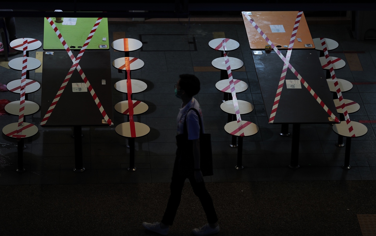 Tables and seats in the Chinatown Complex Food Centre taped up with plastic and red tape. Stalls are allowed to open for takeaways and deliveries only during the circuit breaker. Customers cannot sit and eat at the tables.