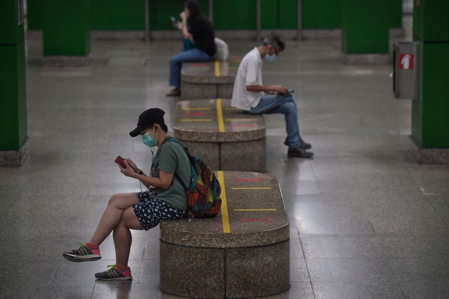 Above: Commuters wearing masks and observing safe distancing while sitting and waiting for the next train in Novena MRT station on April 17.