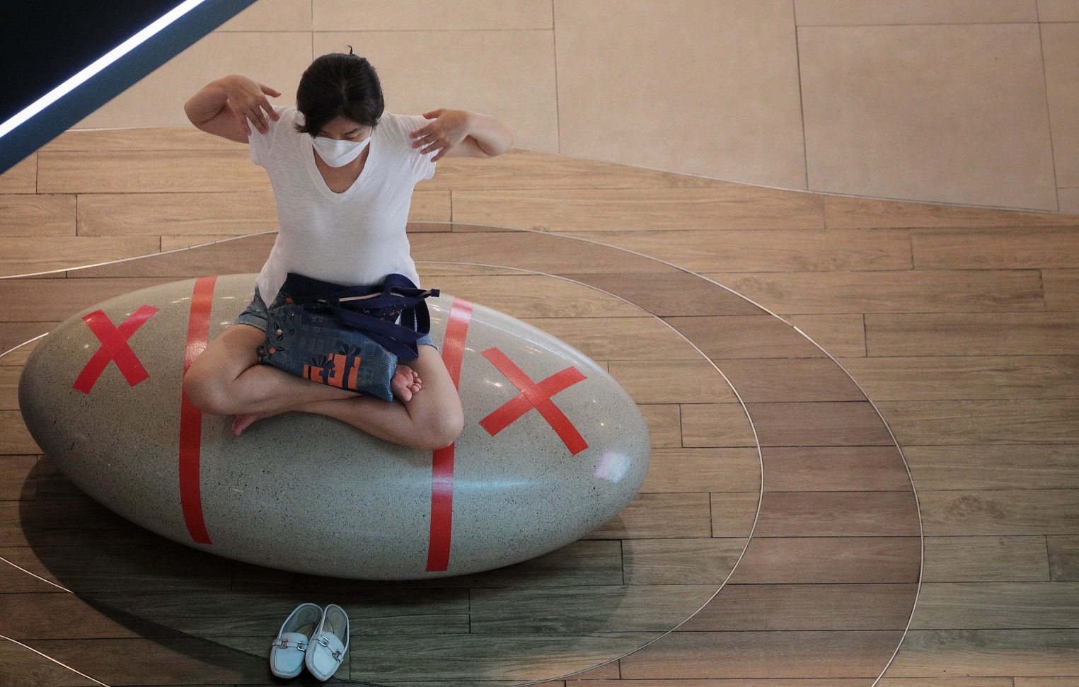 Shoppers observing social distancing while seated around a fountain surrounding the bubble lifts in Golden Landmark Shopping Centre on April 4. Known as a haven for gemstones, traditional Malay clothing and cuisine, the mall saw many businesses not categorised as essential services closed during the circuit breaker period.