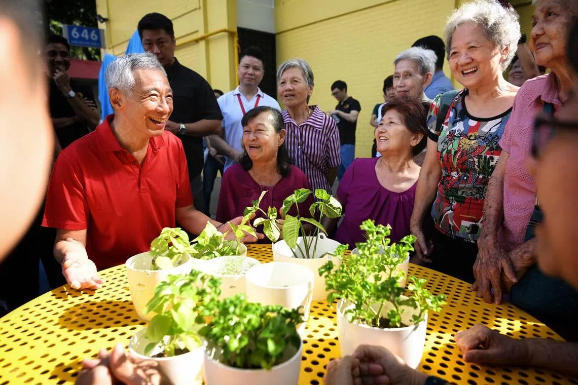 Prime Minister Lee Hsien Loong mingling with elderly residents at the blue court near Blk 646 Ang Mo Kio Ave 6, on Dec 2.