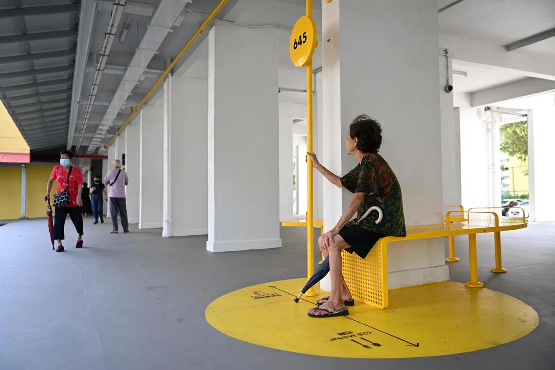 An elderly resident resting at the “buoy” at Blk 645 Ang Mo Kio Ave 6, on Dec 2, 2023.