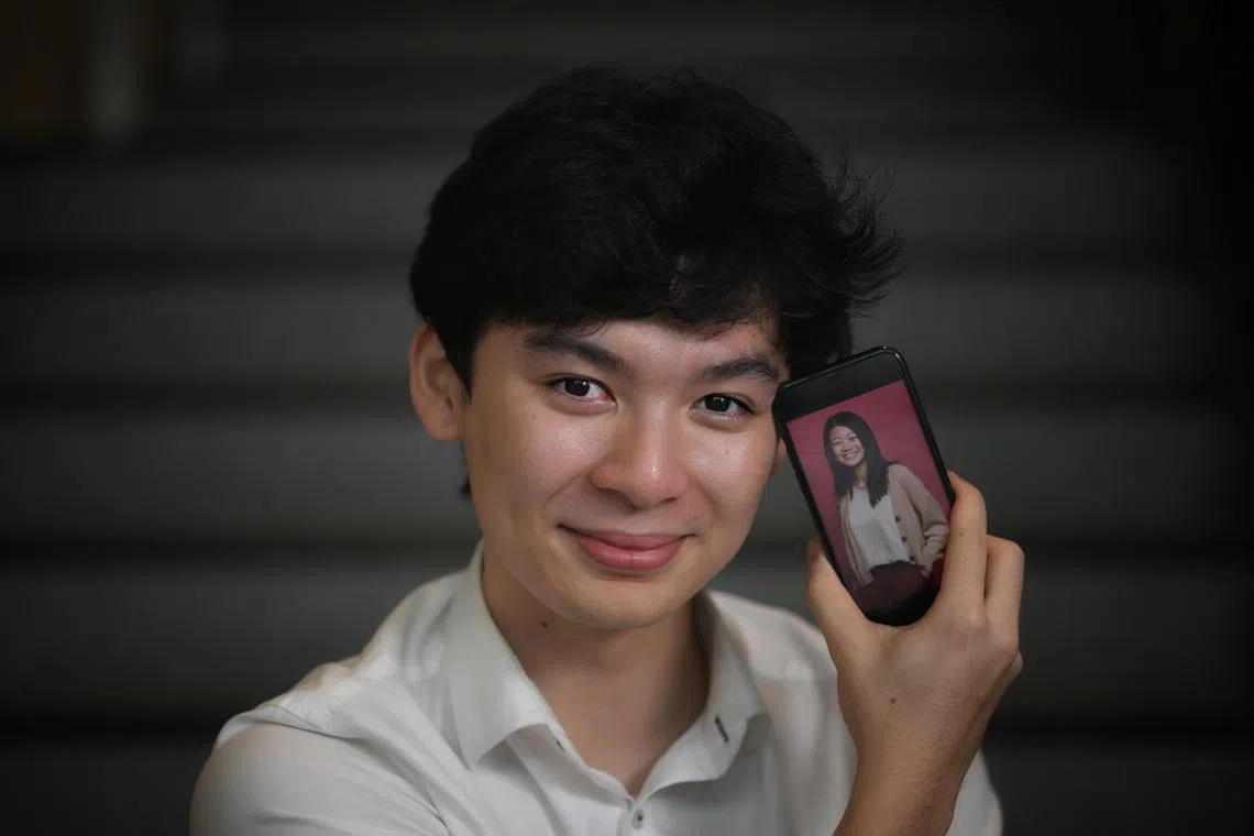 Mr Aedann See, 19, holds a photo of his sister Deanna, who won the award in 2017.
