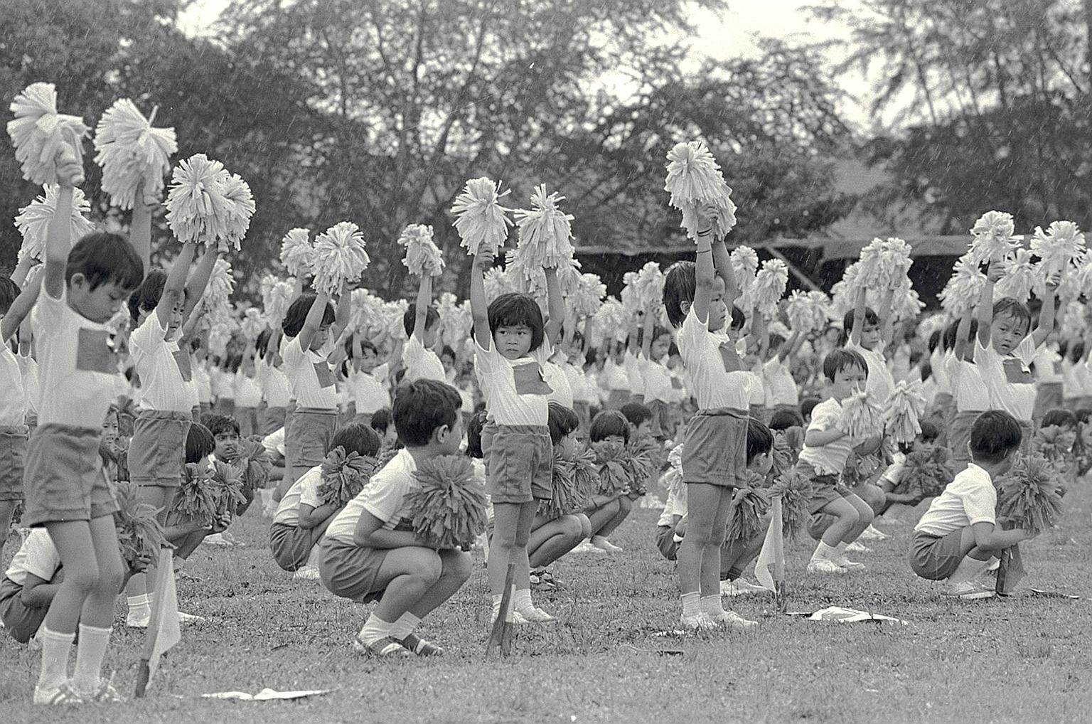 Children at a People's Association (PA) kindergarten sports meet at Ahmad Ibrahim Secondary School on Oct 24, 1976. Today, the PA organises a wide array of sporting activities through Community Sports Clubs to foster bonding among residents.