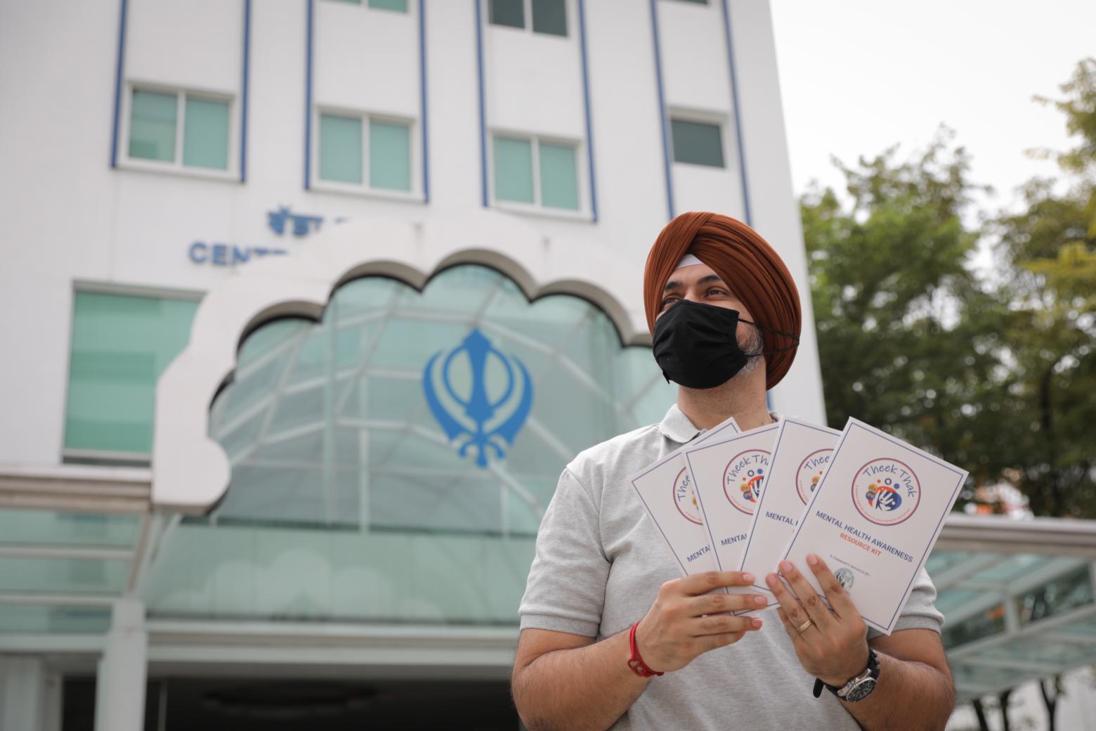 Sikh Welfare Council management committee member Sarabjeet Singh with the resource kits that address mental health concerns.