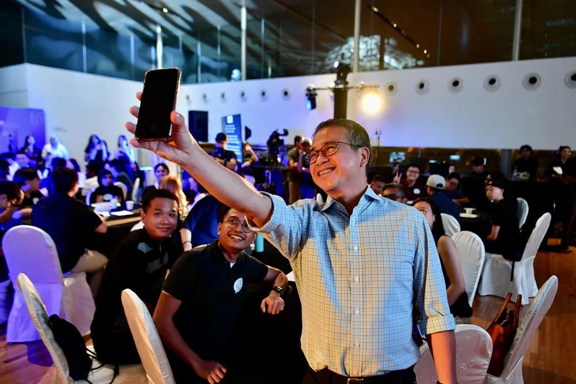 Guest of honour and Minister for Culture, Community and Youth Edwin Tong taking a selfie with a group of participants before the start of the forum.