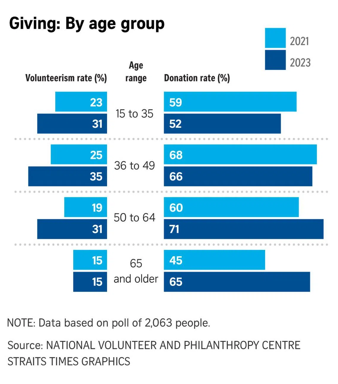 This could be due to time and money constraints as more young people enter the workforce and start families, and hence have a greater need to save up for other priorities, the report by NVPC added.