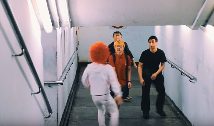 Another site is an underpass, where the "clown" tries to scare passers-by by jumping out from around the corner. Most people, however, look more bewildered than terrified.