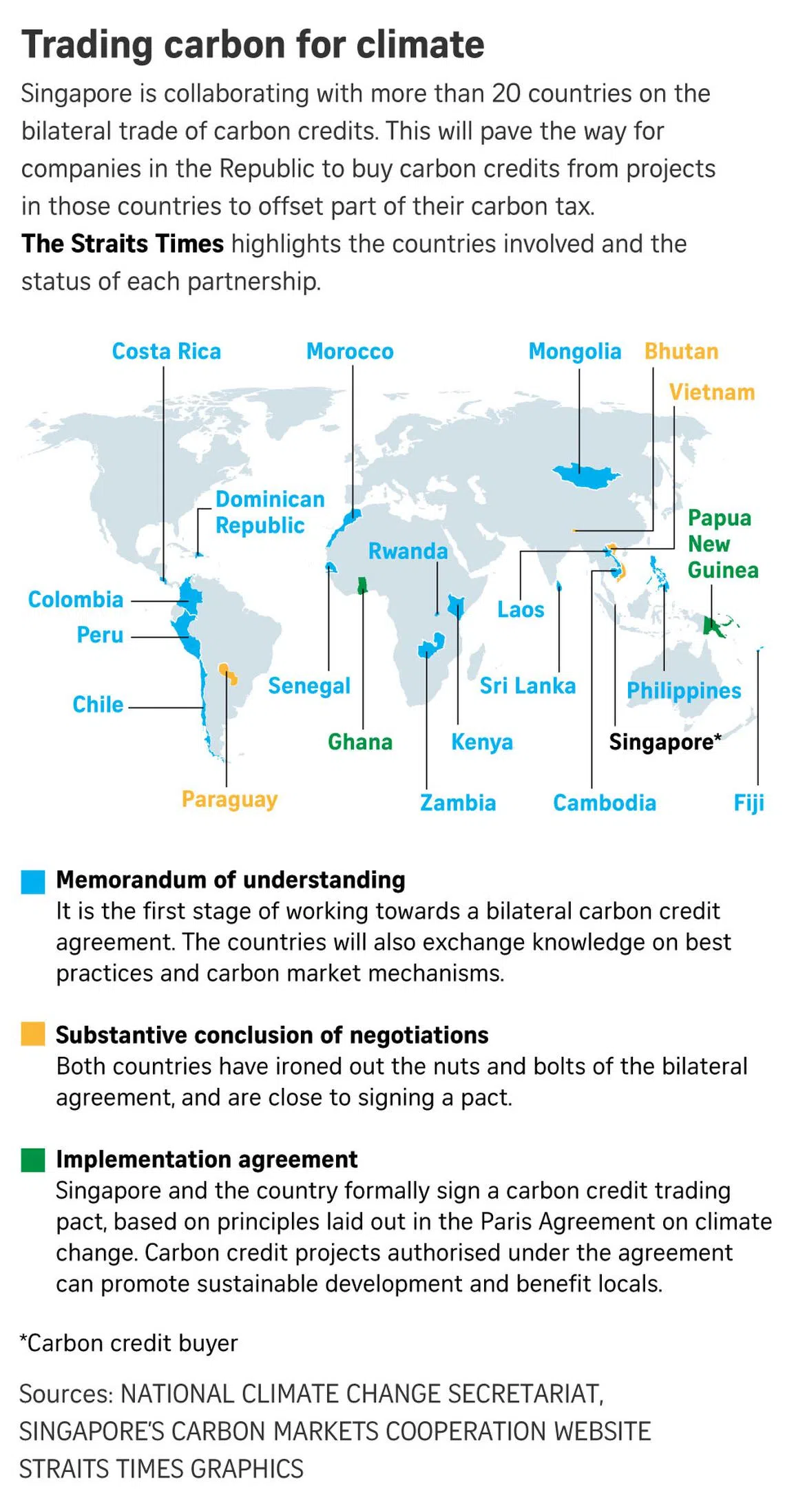 Once an implementation agreement is signed, carbon tax-liable companies in Singapore will be able to buy carbon credits from projects in partner countries to offset up to 5 per cent of their taxable emissions.