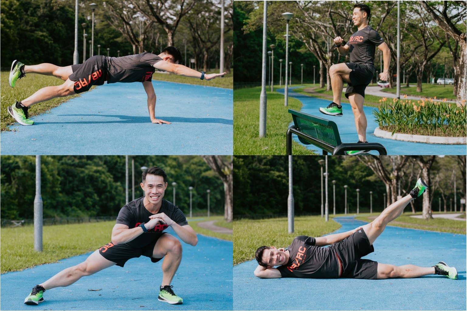 Strengthen your upper and lower body muscles with exercises like (clockwise, from top left) the high bird dog plank, step up with knee raise, side lying leg lift and side lunges.