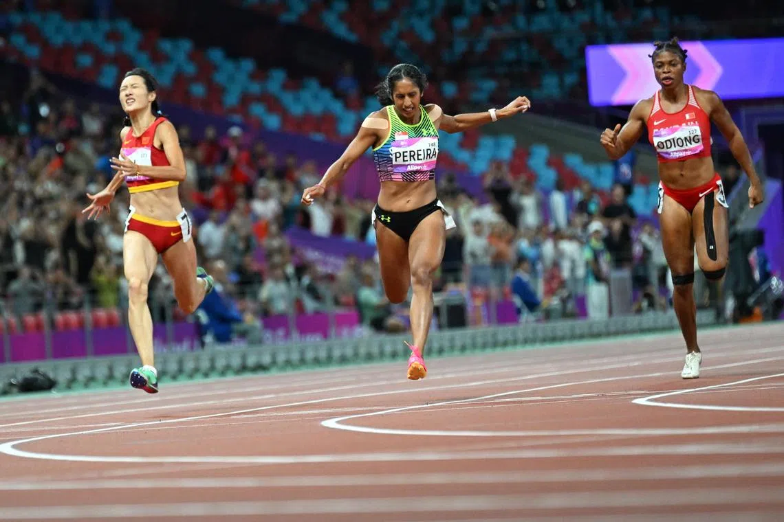 Shanti Pereira winning the Asian Games women’s 200m final in Hangzhou on Oct 2.