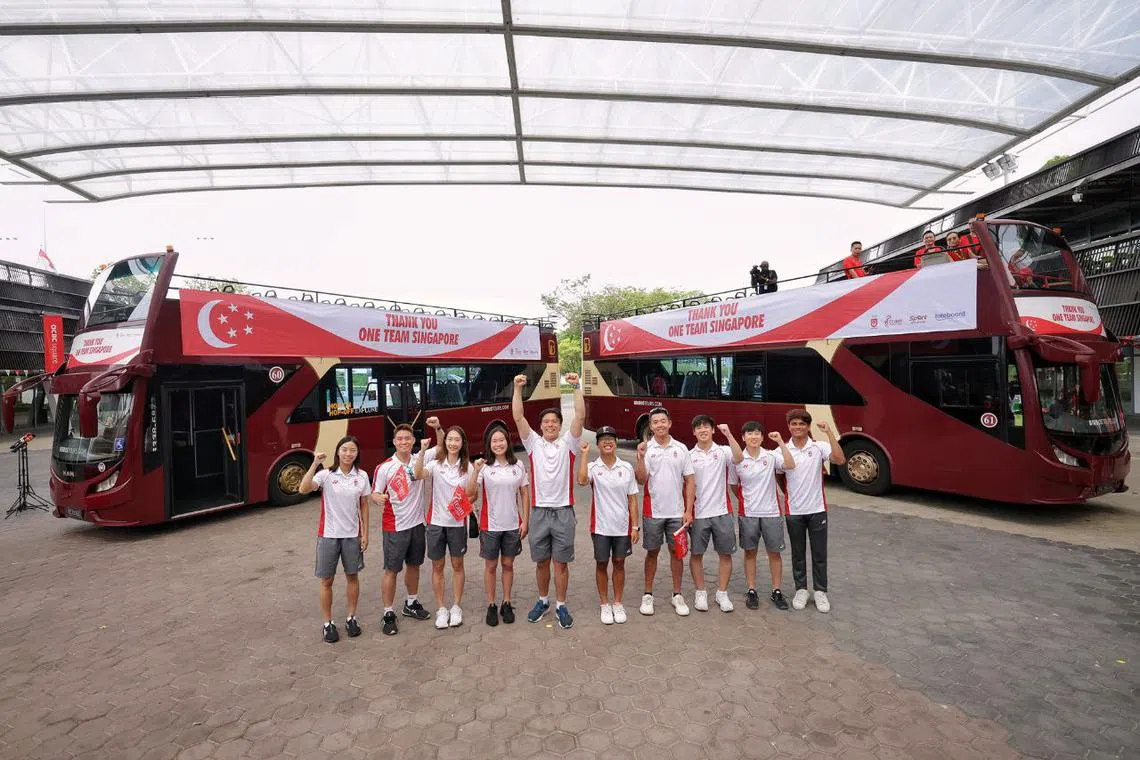 The bus carrying Maximilian – Singapore youngest Olympic medallist – badminton players Yeo Jia Min, Terry Hee and Jessica Tan, swimmer Gan Ching Hwee, kayaker Stephenie Chen, sailor Ryan Lo, sprinter Marc Louis and table tennis players Izaac Quek and Zhou Jingyi, set off from the Singapore Sports Hub shortly after 11.30am.
