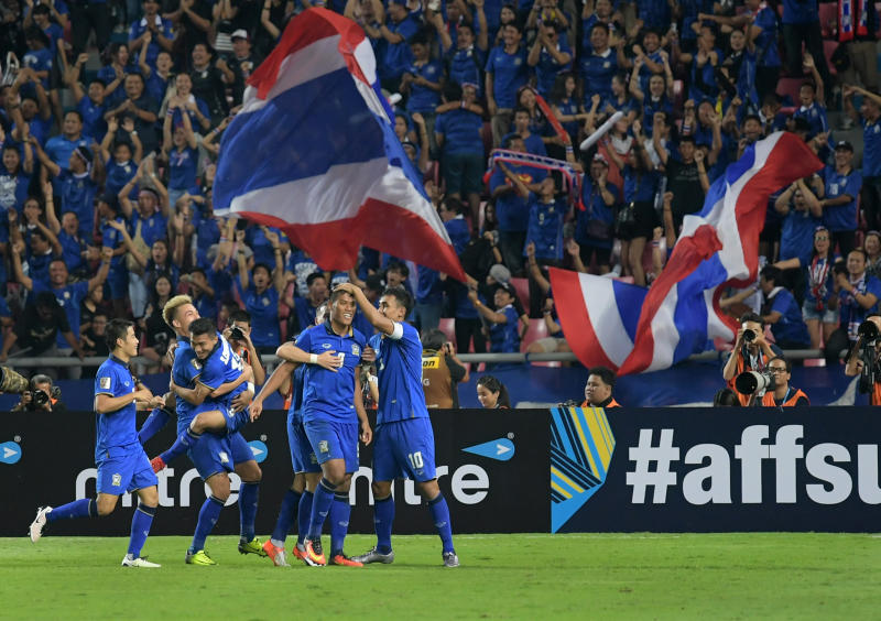 A file photo taken on Dec 17, 2016, shows Thailand's players celebrating their second goal against Indonesia during the Asean Football Federation Suzuki Cup final.