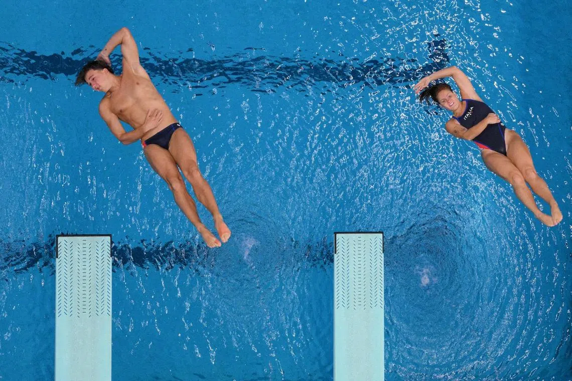 The crowd roared straight after the Italians’ fifth and final dive as their 308.13 total meant that they finished first, ahead of Australia’s Maddison Keeney and Cassiel Rousseau (307.26) and the Chinese pair, who took the bronze with 305.70 points.