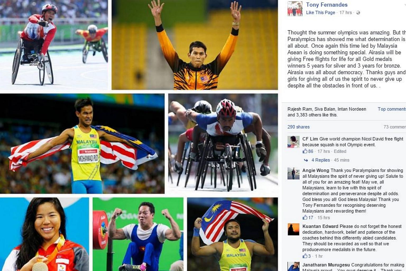 A screengrab of AirAsia CEO Tony Fernandes' Facebook post announcing the reward for Asean's Paralympic medallists.