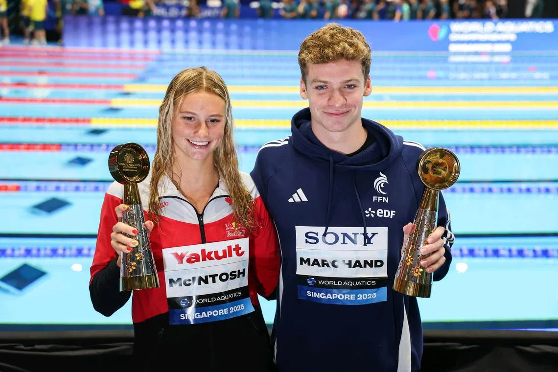 Canadian Summer Mcintosh (left) and Frenchman Leon Marchand are named the best female and male swimmers of the 2025 World Aquatics Championships.