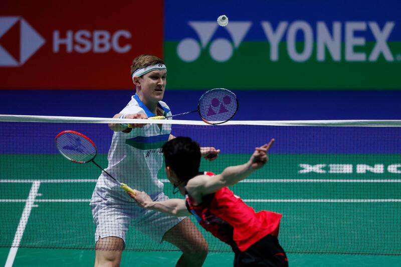 Denmark's Viktor Axelsen (left) and Malaysia's Lee Zii Jia during a rally at the All England Open Badminton Championship men's singles final on March 21, 2021.