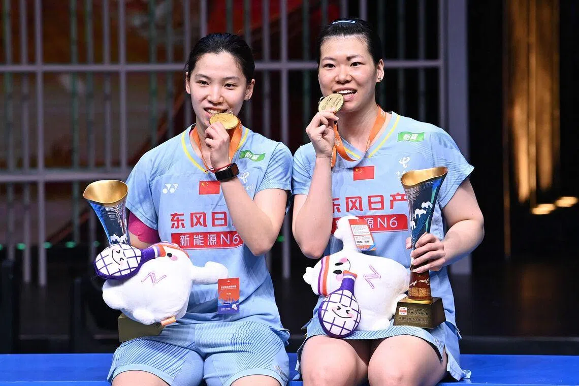 China won the women’s doubles with Li Yijing (left) and Luo Xumin (right) crowned champions after Liu Shengshu and Tan Ning withdrew while trailing 8-5 in an all-Chinese final.