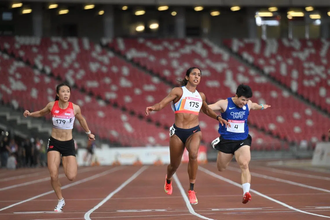 Shanti Pereira (centre) wins the Singapore Open Track and Field Championships women's 100m final ahead of compatriot Elizabeth-Ann Tan (left) and Taiwanese Hu Chia-chen.
