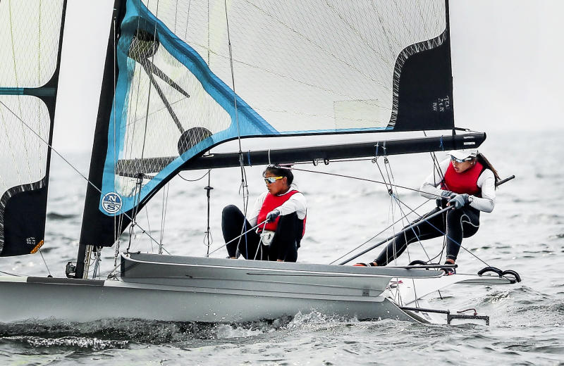 This routine is one of the reasons the pair are top of the 49erFX fleet with 13 nett points at the moment, ahead of China's He Xian and Yu Xuebin and India's Varsha Gautham and Sweta Shervegar (37 nett points each).