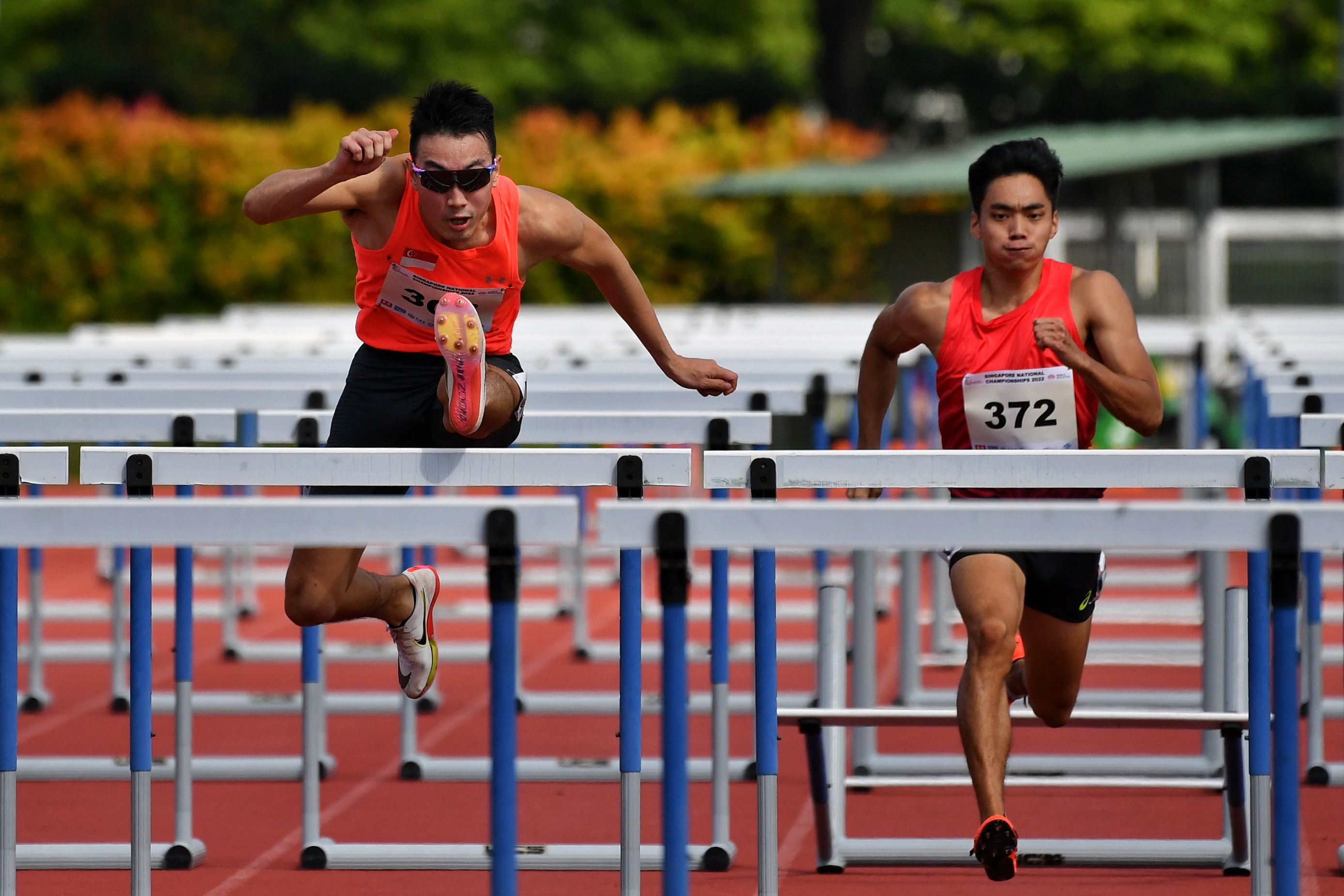 Ang Chen Xiang (left) and Awyong Liang Qi in the Men’s 110m hurdles in the Singapore Athletics National Championships on Jan 23, 2022.