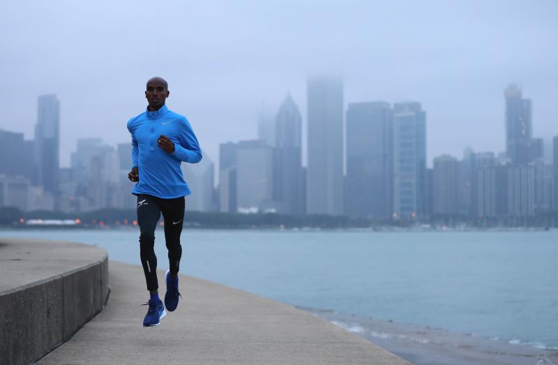 Mo Farah on a training run alongside Lake Michigan ahead of the 2018 Bank of America Chicago Marathon.
