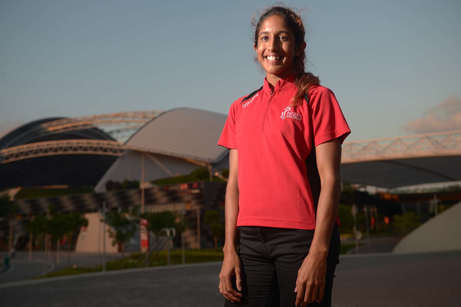 Sprinter Shanti Pereira posing infront of the Singapore Sports Hub, on March 11, 2016.