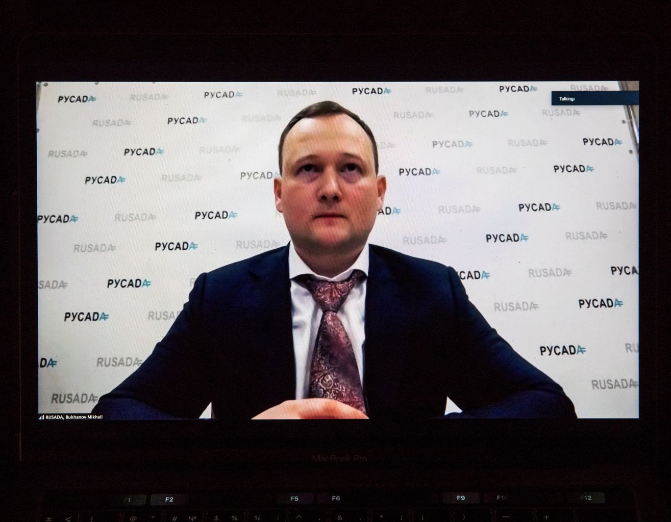 Rusada acting director-general Mikhail Bukhanov is seen on a screen as he attends a news briefing in Moscow, Dec 17, 2020.
