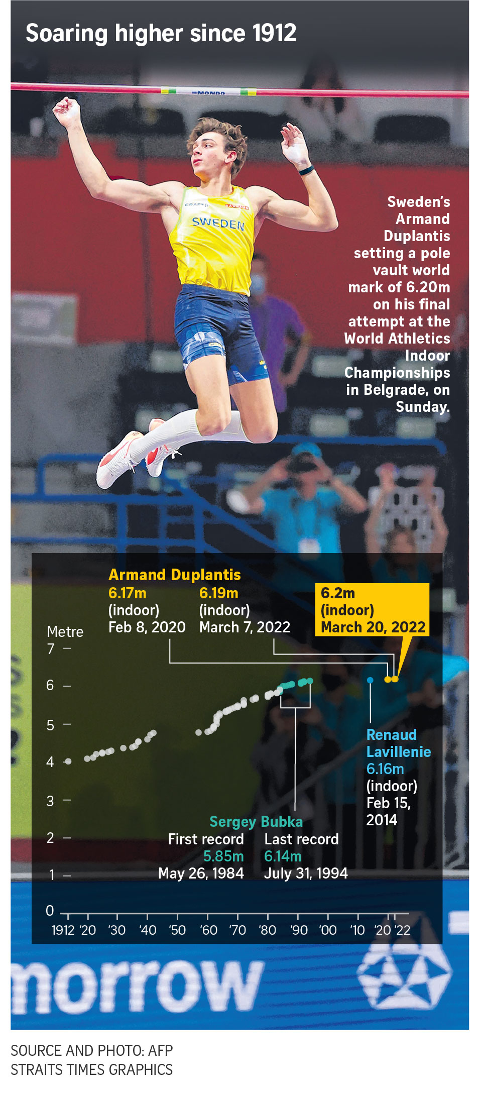 BELGRADE (REUTERS) - Sweden's Armand Duplantis broke his own men's pole vault world record on Sunday (March 20), jumping 6.20 metres at the World Indoor Championships in Belgrade.