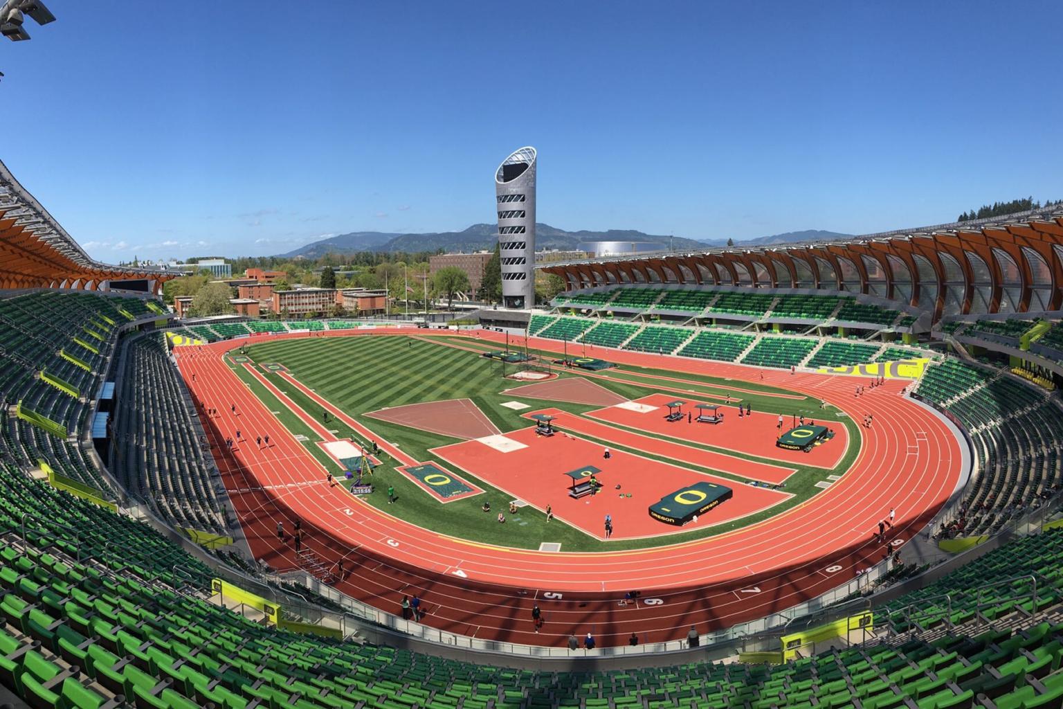 The meet, staged in breezy and wet weather, was the first elite event contested at the University of Oregon's renovated Hayward Field.