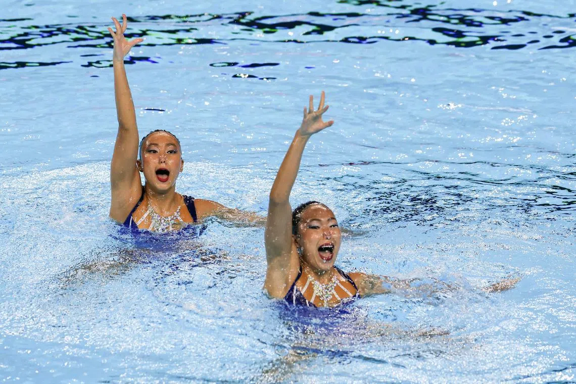 Singaporean artistic swimmers Yvette Chong (left) and Debbie Soh competing in the women’s duet technical event at the World Aquatics Championships on July 18.