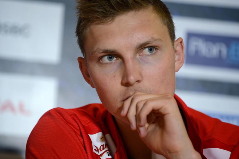 Viktor Axelsen listens during a press conference ahead of the Thomas and Uber Cups badminton tournament in Bangkok on May 19, 2018.