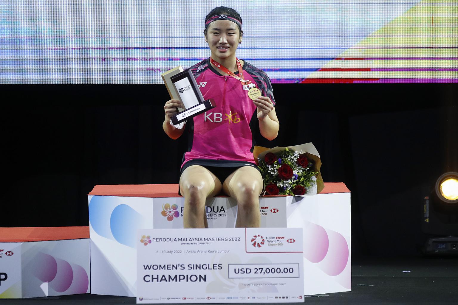 The women's singles saw South Korea's rising star An Se-young crowned champion after she breezed past China's Tokyo Olympic gold medallist Chen Yufei, seeded one spot below her at No. 4, 21-17, 21-5 in a one-sided final.
